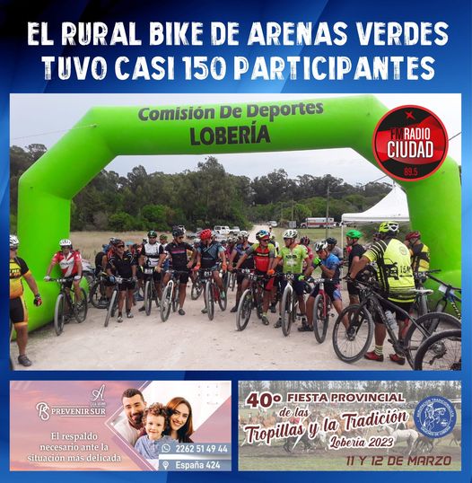 El pasado domingo se realizó el Rural Bike en Arenas Verdes, con 149 participantes que recorrieron el circuito rodeado de naturaleza.En la prueba principal femenina, resultó ganadora Marilina García (Necochea), seguida por Sol Circelli (Balcarce) y Claudia Merlo (Lobería).En la competencia masculina ganó Cristian Giuliano (Balcarce), fue segundo Gastón Llanos (Necochea) y tercero Martín Sorice (Necochea).#Lobería#Deportes#ArenasVerdes#RuralBike#Ciclismo