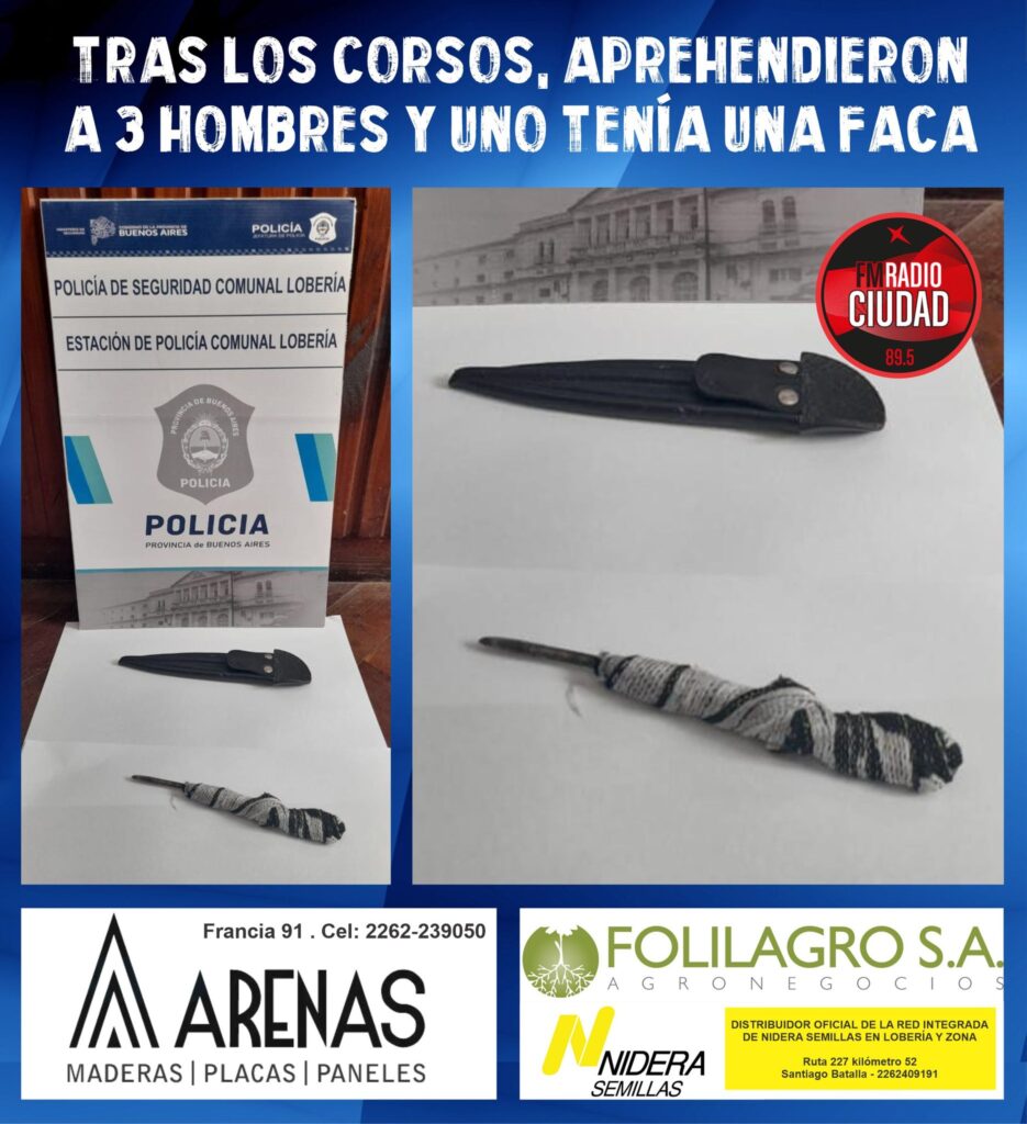 Culminados los espectáculos de anoche, sobre Avenida Mitre 30, la Policía vio a varias personas corriendo, provocando disturbios y peleando entre sí. Al ser interceptados, dos de ellos, lejos de desistir su actitud y pese enfrentar a los uniformados, fueron aprehendidos en calle Aristóbulo del Del Valle 130. En la requisa realizada a los hombres sobre sus ropas, se procedió al secuestro de una punta (faca) y vaina de cuchillo color negra en poder del masculino de 35 años. El personal policial no sufrió lesiones.