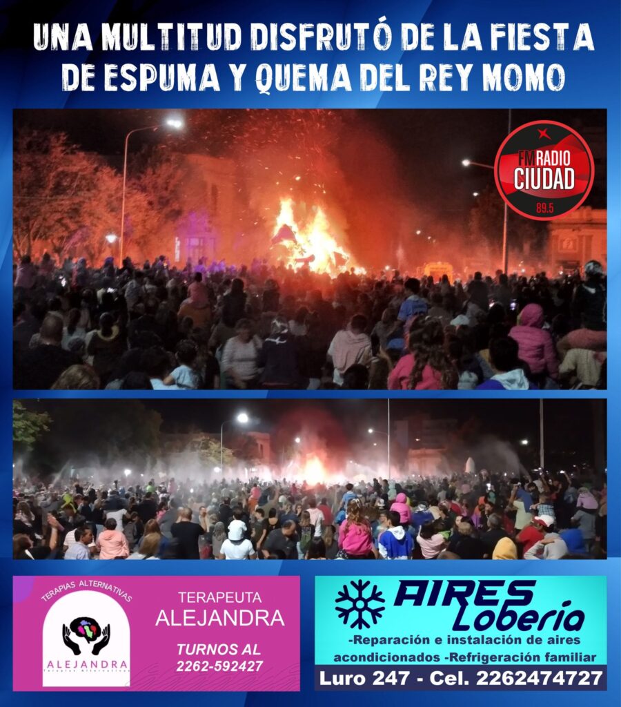 Anoche, cerca de las 2 de la mañana, se llevó a cabo el cierre absoluto de los corsos loberenses, con la tradicional quema del Rey Momo.Previo a ello se llevó a cabo, como de costumbre, la fiesta de espuma, la cual nación espontáneamente hace muchos años y se mantiene con el tiempo, con grandes y chicos lanzando espuma hacia arriba, quedando todos pintados de blanco.Enseguida, el muñeco gigante realizado por la Asociación Amigos de los Niño, es consumido por las llamas ante el aplauso generalizado del público, que un año más acompañó de manera masiva los carnavales, la fiesta más popular de Lobería.#CorsosLoberenses2023#Carnavales2023